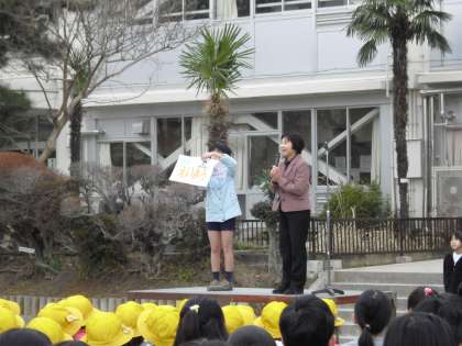 新学期になって、うれしいことにインフルエンザによる欠席者は0人が続いています。また、金曜日は全校での欠席者が5名と、大変少なかったです。しかし、近隣の小学校では、おなかにくる風邪や、ノロウィルスの発生などが報告されています。まだまだ、気をつけていかなくてはなりません。今日の保健朝会では、今一度、風邪を予防するための7つの心がけのお話と、手洗い歌のやり方について平尾先生から教えていただきました。3学期も、みんな元気で乗り切りましょう!