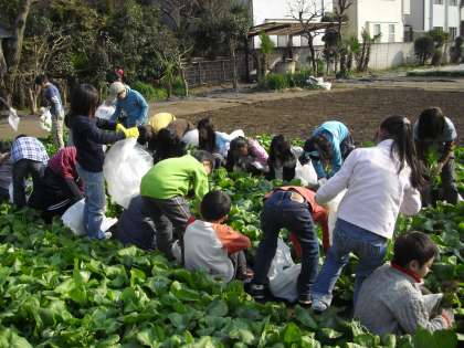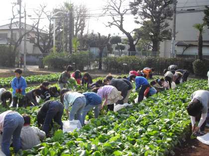 昨日は2年生が小松菜とりをしました。学校の目の前の畑です。ここには、この期間中世田谷区内の幼稚園から小学校までいろいろな学校の児童が小松菜とりに来ます。深沢小のトイレを貸してあげています。
