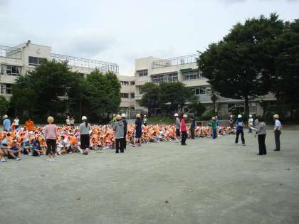 火災が校内で発生し一度校庭に避難した後、さらに火が強くなり、2次避難を行う、という想定で行いました。