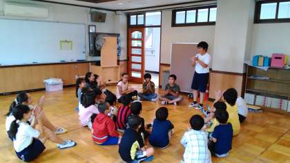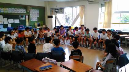 あいにくの雨模様で校庭が使えませんでしたが、教室で上の学年がリードして楽しい休み時間を過ごしました。