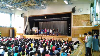 児童集会委員が、ステージで昔話などを無言で演じ、それが何のお話か当てるクイズを行いました。話の内容がわかる場面を集会委員が考え、身振り手振りで上手に伝えることができていました。