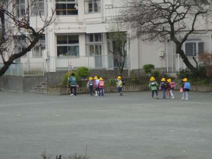 学童に向かう子どもたちも、一列に並んで校庭の端を通って行きます。