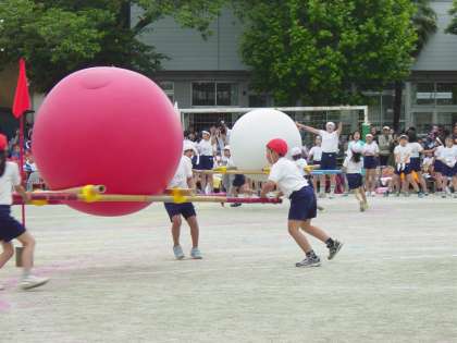 大玉はこびでは、4人で協力してバランスよく運ぶことができました。