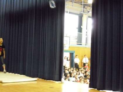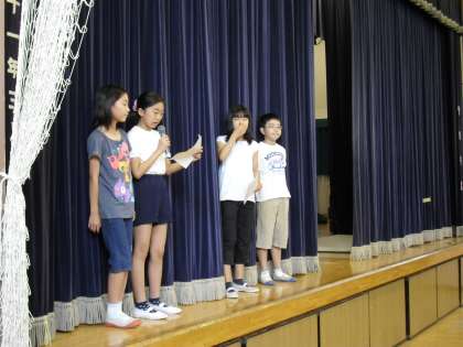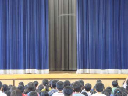 はじめの言葉やゲームの説明の後、幕を少し開けたステージの中で、児童集会委員が投げたもの(ランドセルやボールなど)をみんなで当てました。最後の反省会では、低学年にも分かりやすい集会ができたと話し合いがでたようです。