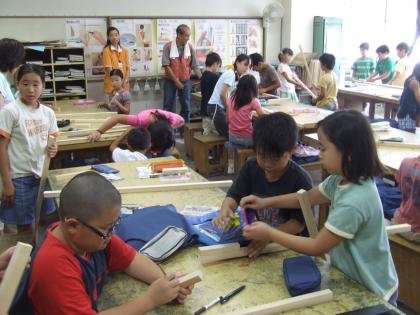 4年生の図工の時間に、石井工務店の方がのこぎりとかなづちの使い方を教えに来てくださいました。力の入れ方をどうしたらいいか、やっぱりプロの方のアドバイスには説得力があります。時間がたつのを忘れるくらい、集中して作業に取り組めました。