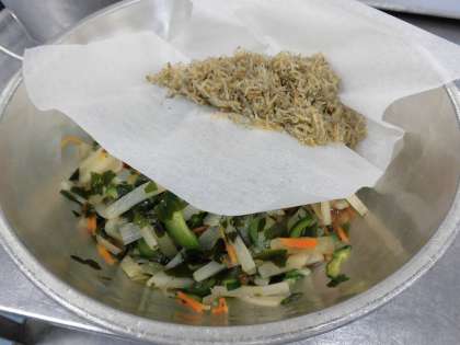 今日の『じゃこサラダ』は今までと少々配食の仕方を変えてみました。今までは給食室で野菜、ちりめんじゃこ、ドレッシングをすべてあえてからクラス分けしていましたが、今日は、各教室で給食当番が配る時にちりめんじゃこをあえてもらいました。