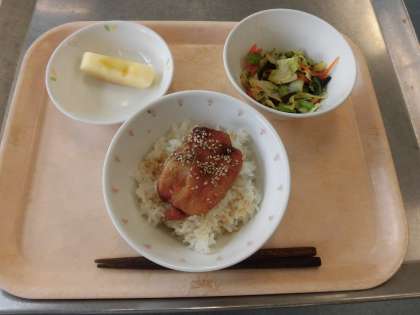 【献立】照り焼きどんぶり・キャベツのひたし・りんご・牛乳