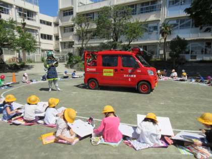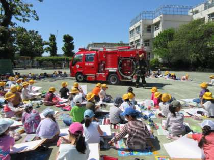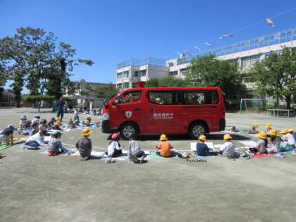玉川消防署のご協力で、1,2年生の消防写生会を行いました。真っ赤な消防車や消防服を着た消防士さんを見ながら子どもたちは画用紙に思い思いに絵を描いていました。