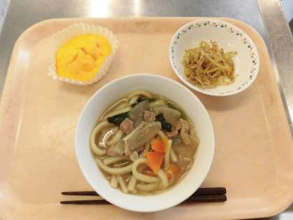 【献立】けんちんうどん・もやしのカレーじょうゆかけ・キャロットケーキ・牛乳