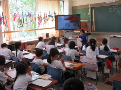 1時間目の算数は大きな数の学習です。視聴覚機器を活用して100のまとまりや100が10個で1000になることを子どもたちに視覚的に気づかせていました。
