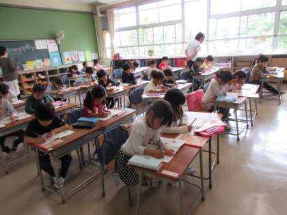そのうち、1年1組は国語で点や丸がつく文字を繰り返し声に出して読んでいました。2年1組の国語ではかたかなで表す言葉を友達と考えていました。4年3組国語では接続語を使って文をつなげる学習をしていました。