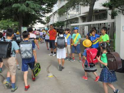 深中も運動会が先週終わり、小学校も中学校も落ち着いた生活にもどっています。今朝は毎月行われている学び舎のふれあい挨拶デーです。