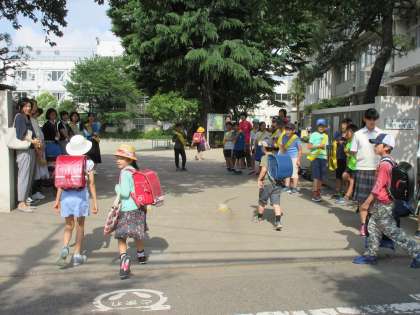 8時前には深中の生徒と先生、深小の子供たちと先生、保護者が集まり、あいさつの言葉を交し合い、活気ある時間となりました。