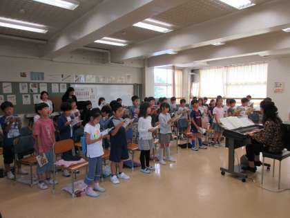 音楽室では3年生がきれいな歌声で「にじ」を歌っていました。27日の音楽朝会でこの曲を全員で歌います。