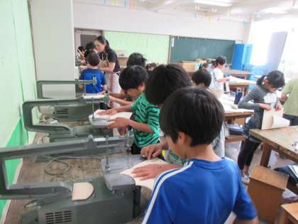 図工室では5年生がマイ・ギターの製作。電動のこぎりを使って、自分の考えた形に板を切っていました。