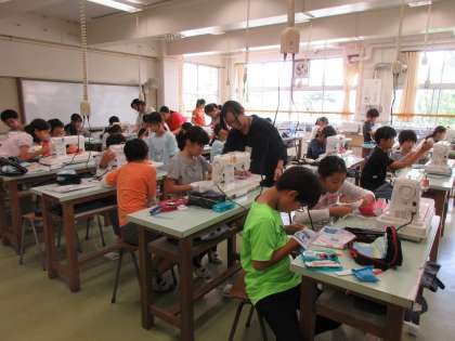 家庭科室では5年生がはじめてのミシンの使い方の学習。学習ボランティアの皆様がサポートに入ってくださっていました。