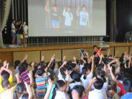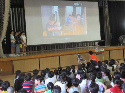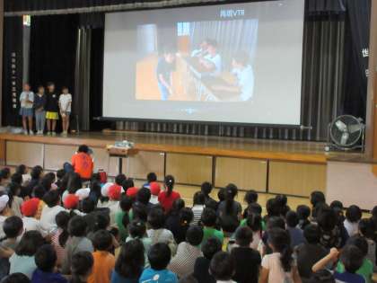 集会委員が先生の得意なことや好きなことを演じた映像を作り、それを体育館の大きなスクリーンに映し出しました。見事な出来栄えです。