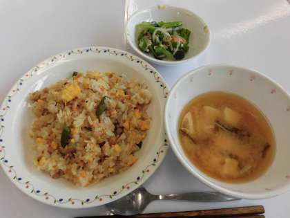 【献立】そぼろごはん・オクラともやしのひたし・みそ汁・牛乳