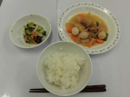【献立】ごはん・豚肉と大根のうま煮・和風サラダ・牛乳