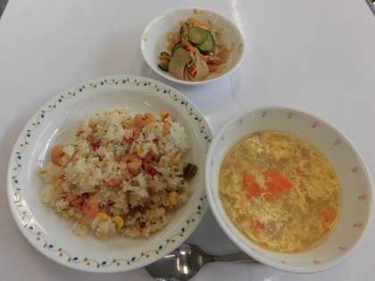 【献立】ナシゴレン・こんにゃくサラダ・たまご入り野菜スープ・牛乳