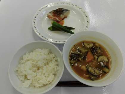 【献立】ごはん・揚げ鯖の梅肉風味・おくらのおかかかけ・夏野菜のみそ汁