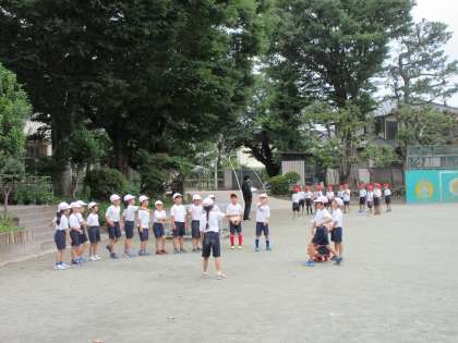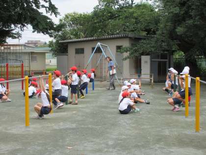 プールが始まったのですが気温が低いためなかなか入れません。2年生が3クラス校庭で体育をしていました。