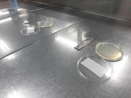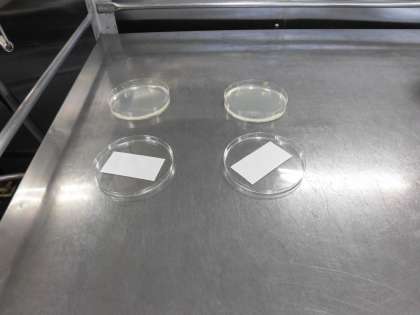 サラダやごはんなどをクラス分けする作業台にシャーレを置いて検査しました。5分間放置し、その後蓋をしめます。それぞれの検体は検査会社が回収にくるので、引き渡して検査終了です。