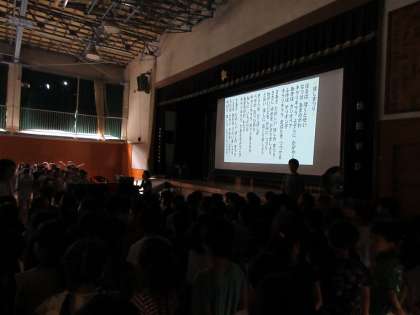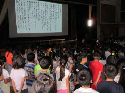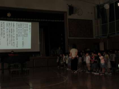 1学期最後の音楽朝会はみんなで「ほしまつり」を歌いました。夜空をイメージできるようにと体育館を暗くしました。体育館には夜空にまたたく星のような子どもたちの優しい歌声が響き渡りました。