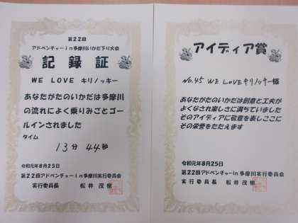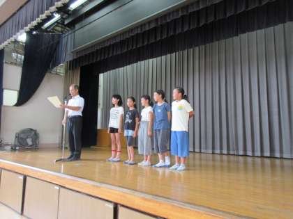 8月25日の行われたアドベンチャーin多摩川いかだ下りに5年生チームが参加をしました。見事ゴールをすることができました。また、キリノッキーのデザインが評価され、特別賞もいただきました。始業式終了後、表彰しました。いかだは今特別学習室に置いてありますのでよかったらご覧ください。