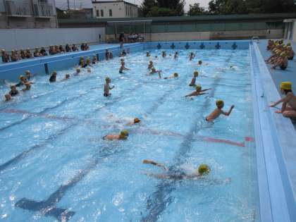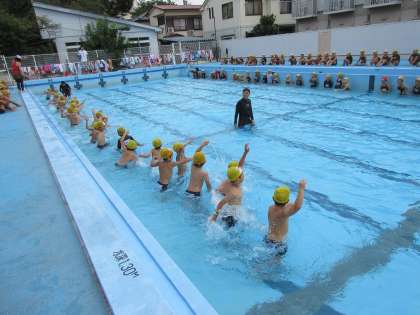 2学期最初のプールは1年生。6月からプールを経験している子どもたちはずいぶんプールに慣れてきました。