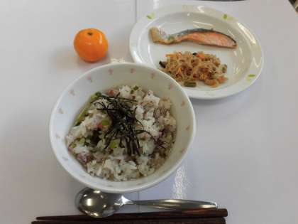 【献立】梅茶漬け・鮭の塩焼き・切り干し大根の煮つけ・冷凍みかん・牛乳