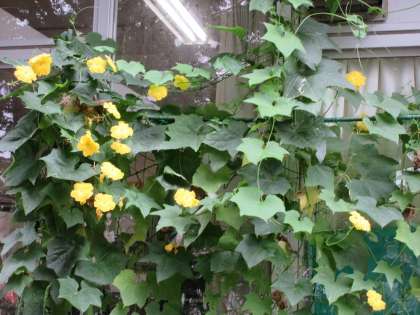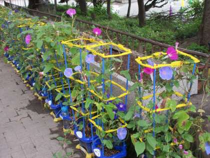 朝校庭に出てふと目に入ったのが校舎の壁に沿って伸びたへちまの黄色いたくさんの花でした。見事に咲いています。4年生が理科の学習で植えたものです。犬走りには1年生が育てている朝顔もまだ青や紫の花を咲かせています。夏休みは各ご家庭で育てていただきました。