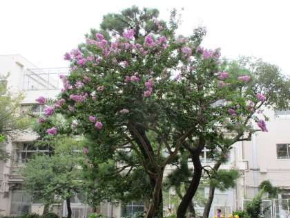 校庭の周りの1本の木もきれいな紫色の花を咲かせていました。さるすべりの木です。