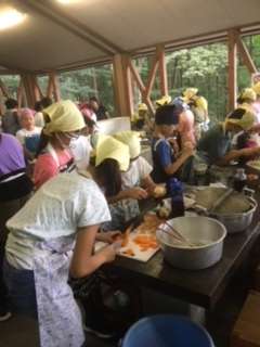 夕食のカレー作りが始まりました。まずは野菜の皮をむいて、切るところからです。