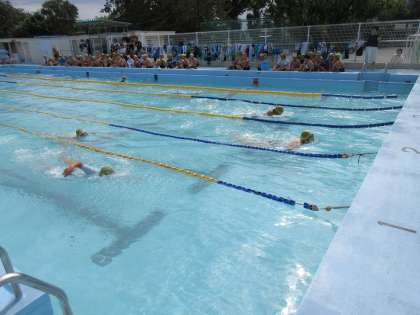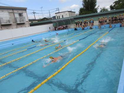 記録会の最後は男女別の8人による選抜リレー。6年間のプールの締めくくりとして全員で自由に25mを泳ぎました。