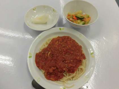 【献立】スパゲティーミートソース・野菜のイタリアンドレッシングかけ・梨・牛乳