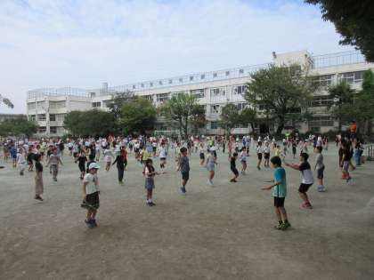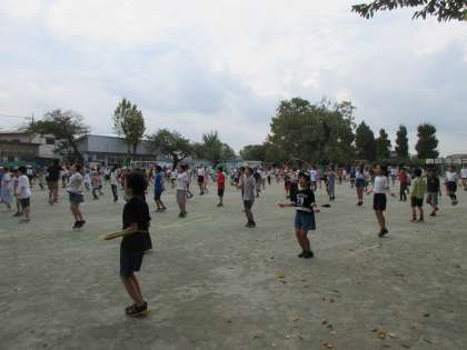今日は4年生以上の体育朝会です。学校では2学期に子どもたちに縄跳びを奨励しています。運動委員会が前に立ち、手本を見せてくれながら、駆け足とびに足の前後や左右の振りをいれた技にも挑戦していました。