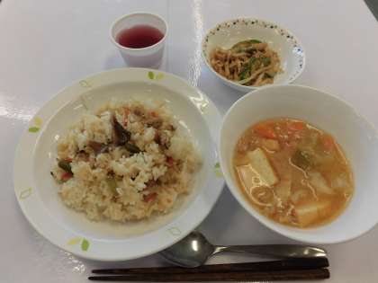 【献立】まいたけごはん・生揚げのみそ汁・ごま酢かけ・ぶどうゼリー・牛乳