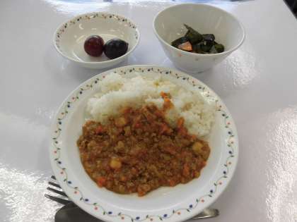【献立】ひよこ豆のカレーライ・わかめサラダ・ぶどう・牛乳