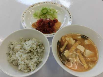 【献立】青のりごはん・魚フライ・マッシュルームソース・ボイルキャベツ