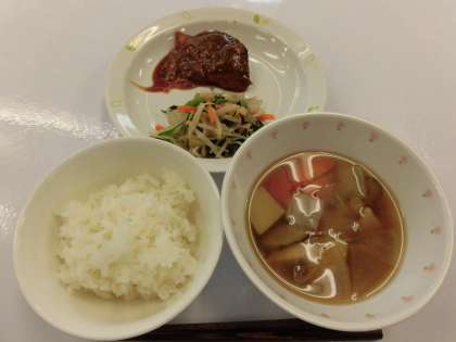 【献立】ごはん・さばのみそ煮・おひたし・根菜汁・牛乳