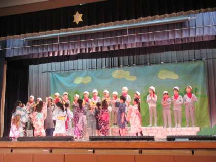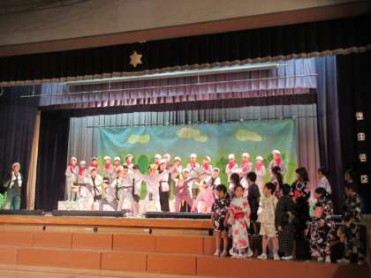2年生は民話劇。お地蔵さん、きつね、お侍さん、村の子供たちなど多くの登場人物が登場。笑いを誘う子供たちの演技に注目です。