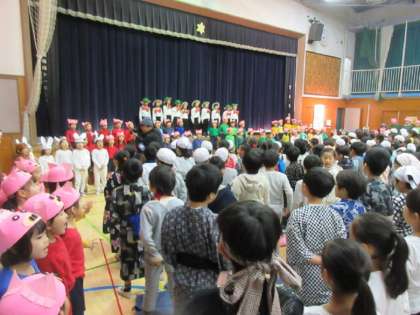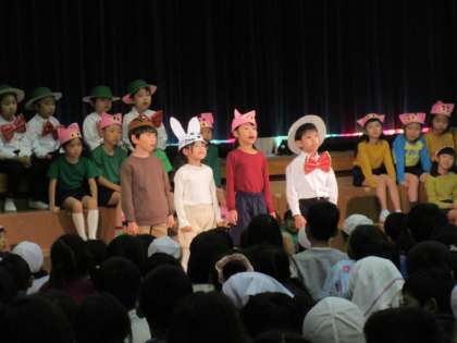 2日目の学芸会は1年生の初めの言葉で開幕。大きな声で堂々と言うことができました。今日も「心を一つにして頑張ろう」をめあてに子どもたちが劇を発表します。