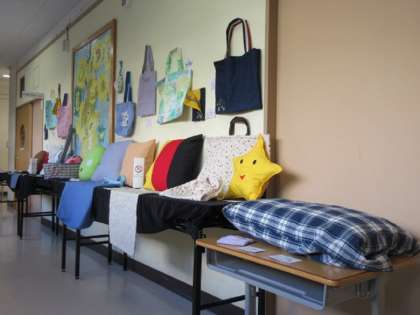 廊下には6年生の家庭科の作品を展示しています。劇と合わせてどうぞご覧ください。