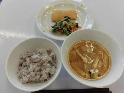 【献立】ゆかりごはん・いかの七味焼き・おひたし・さつま芋のみそ汁・牛乳