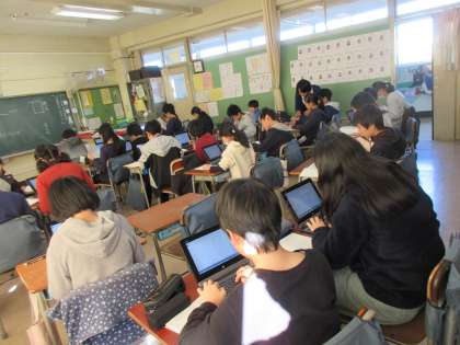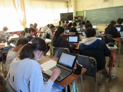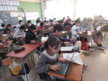 6年生がタブレット型パソコンに文字入力して卒業文集の原稿作りに取り組んでいました。子どもたちはこれまで様々な学習の中でパソコンを操作・活用してきました。