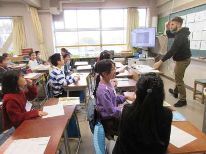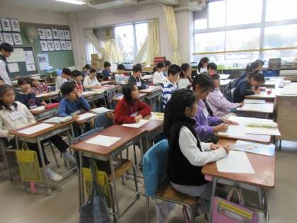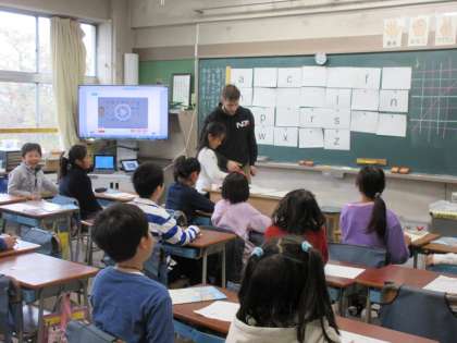 4年生がジェイムズ先生とアルファベットの学習をしていました。ビンゴカードに子どもたちがアルファベットを書いてみんなでビンゴゲームをします。