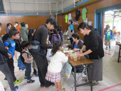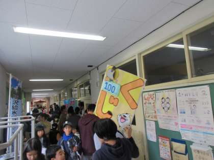 PTAのくじ屋さんは魅力的な景品があり大人気。廊下まで長蛇の列が続いています。