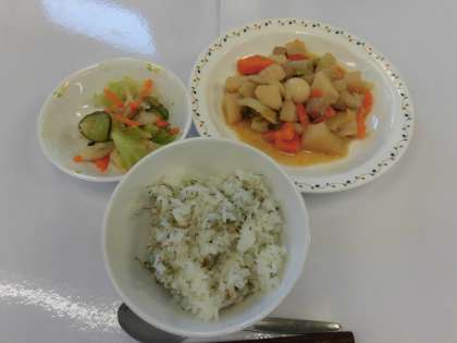 【献立】じゃこと青のりのごはん・豚肉と大根のうま煮・梅ドレサラダ・牛乳