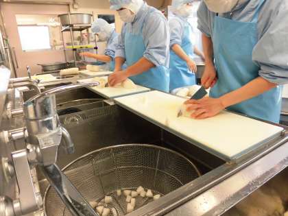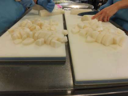 給食室では朝礼終了後、調理師さん7人がかりで一斉に大根を切り始めました。煮え方に差がでないように大きさをそろえます。誰の大根を見ても同じ大きさです。さすがですね。